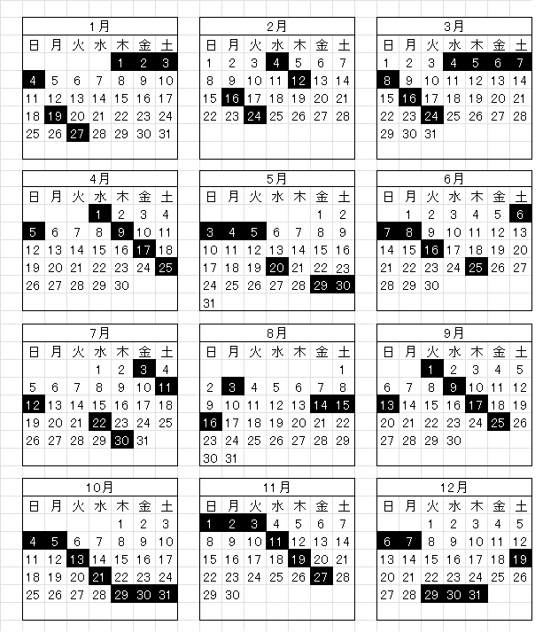 数字を黒く塗ってある日が休みの日です。